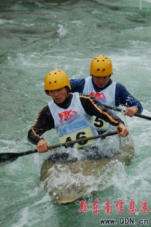圖片新聞(記者 潘光銀)11月25日,參賽選手在激流中奮力劃槳。當日,2006年全國皮劃艇激流回旋秋季冠軍賽在黔東南州