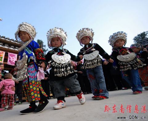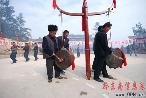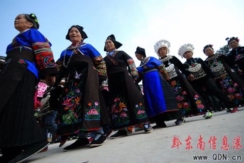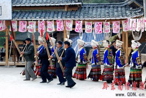 2008年11月25日,凱里市三棵樹鎮(zhèn)附近十村八寨的1000多名苗族同胞匯聚在老鴉村苗寨舉行民族銅鼓舞、蘆笙舞、對唱苗歌等豐富多彩的民俗活動歡送一年一度的苗年。(陳沛亮 攝影報(bào)道)