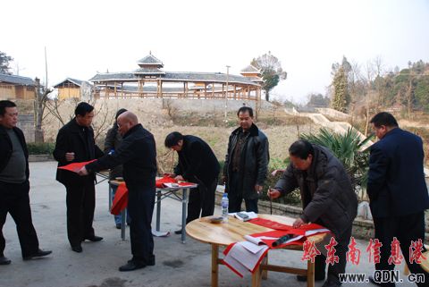 1月17日下午,陽光明媚,天清氣朗,凱里市文聯組織凱里地區書法家到龍場鎮石龍寨義務為老百姓寫春聯,受到當地村民一致好評。據介紹,從2006年開始,凱里市文聯每年新春都組織書法家到石龍寨為村民義務寫春聯,這一良好傳統已延續了4年。(王四錫 攝影報道)