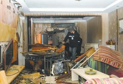 爆炸威力現場清晰可見:該屋朝西向是草坪和小區道路,可看到陽臺門和玻璃窗全部洞開,里面漆黑一片,窗簾被炸飛落在門口的綠化帶和樹枝上。屋內各式家當物品凌亂堆積,墻上的電視被炸塌毀壞,吊頂撕裂下墜,裸露在外的電線扯掛在倒地的桌椅上。