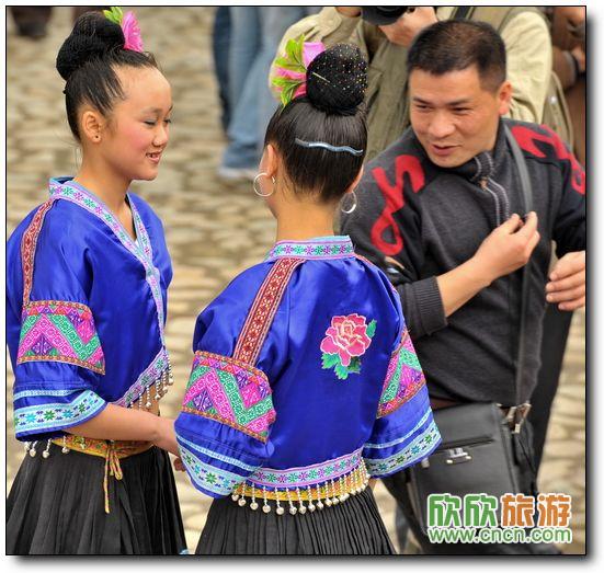 一群短褂短裙的苗族女孩圍在場地中央伴著嘹亮的嗩吶聲一邊轉(zhuǎn)一邊瘋跳起來,舞乍乍的模樣很有趣。