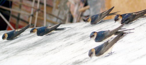 當日上午7時左右,筆者在現場看到,只見兩里多長的電線上和屋檐上密密麻麻的燕子發出呢喃的叫聲,時而繞著樓房、樹木低空盤旋飛舞,時而飛落電線上或屋檐瓦片上,起初是千余只,半小時后燕子越聚越多,達到成千上萬只,構成一幅原生態的亮麗奇觀。上午9時左右,群聚的燕子才開始散去。引來不少村民駐足觀看。