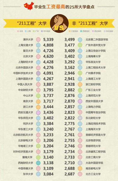 新浪教育訊 近日新浪微博熱傳“畢業生工資最高的25所大學盤點”,在羅列的25所211大學中,清華大學畢業生以5339/月的工資名列第一,上海交大、復旦大學、北京大學、上海財經大學居前五。