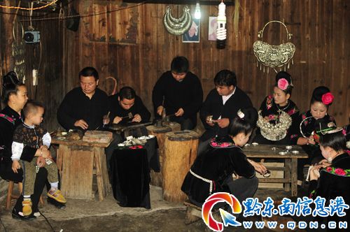 9月以來(lái),雷山縣西江鎮(zhèn)麻料銀匠村的李光雄一家10人都在忙著加工銀飾品,以迎接國(guó)慶節(jié)的到來(lái)。李光雄一家為銀匠世家,祖祖輩輩都靠打制銀飾為生,如今他的3個(gè)弟弟及他2個(gè)兒子、弟媳兒媳們組成10人團(tuán)打制傳統(tǒng)銀飾。目前在西江千戶苗寨開(kāi)有6個(gè)銀飾鋪,僅在國(guó)慶節(jié)的第一天6個(gè)銀飾鋪的純收入就達(dá)3萬(wàn)多元。圖為李光雄一家正在加工銀飾品的場(chǎng)面。(李雪)