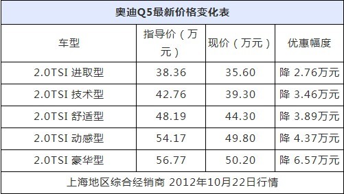 從上海地區某綜合經銷商處了解到,國產奧迪Q5最高可優惠6.57萬,購車另送8800元裝潢禮包,有意向的客戶可撥打電話詳細咨詢。