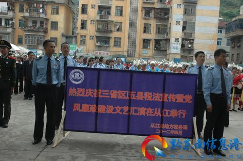 4月18日至19日,湘黔桂三省(區(qū))的黎平縣、三江縣、通道縣、龍勝縣地稅系統(tǒng),組織兩百多名地稅業(yè)余文藝表演隊伍,匯聚位于都柳江畔的貴州從江縣。參加“全國第21個稅法宣傳月”活動。