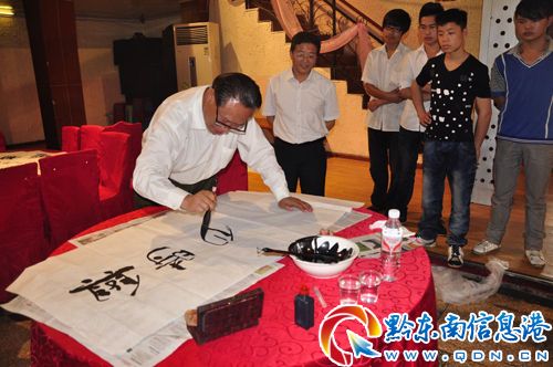 23日,卯秋民一行來到州委外宣辦考察,州委外宣辦、州政府新聞辦主任高俊華、州委外宣辦、州政府新聞辦副主任張曉華、州委外宣辦、州政府新聞辦工作人員楊彩霞等人熱情接待了卯秋民一行,雙方進行了親切交談。在交談中,了解到卯秋民還是一位享有盛名的書法家后,高俊華等人邀請卯秋民揮毫題字。卯秋民欣然應允,當即題寫了“黔東南出奇跡”、“愛國創新”、“博愛”、“忠誠”、“與時俱進”五幅書法作品。(張鴻)