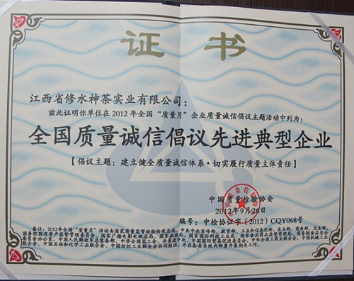 日前,在由國家質量檢驗監督檢疫總局、中共中央宣傳部、教育部、工業和信息化部等國家部委聯合共同組織的2012年全國“質量月”企業質量誠信倡議主題活動中江西省修水神茶實業公司喜獲“全國質量誠信倡議先進典型企業”殊榮,這是對該公司數年來堅持嚴把產品質量關的最好褒獎。