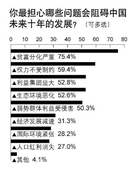 近年來(lái),在經(jīng)濟(jì)社會(huì)高速發(fā)展的同時(shí),一些社會(huì)問(wèn)題與社會(huì)矛盾也越來(lái)越受到關(guān)注。本次調(diào)查顯示,在公眾眼中,最有可能阻礙中國(guó)未來(lái)十年發(fā)展的問(wèn)題依次有:“貧富分化嚴(yán)重”(75.4%)、“權(quán)力不受制約”(59.4%)、“利益集團(tuán)坐大”(52.8%)、“生態(tài)環(huán)境惡化”(52.6%)、“弱勢(shì)群體利益受侵害”(50.3%)、“經(jīng)濟(jì)發(fā)展減速”(31.3%)、“國(guó)際環(huán)境緊張”(28.2%)、“人口紅利消失”(27.0%)等。