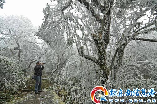 1月7日,由于持續(xù)低溫,位于雷山縣境內(nèi)海拔2178米的雷公山國家森林公園,出現(xiàn)童話般的霧凇、冰柱,晶瑩剔透的玉樹瓊花美景吸引許多游客和攝影愛好者不畏嚴寒前來觀看。(陳沛亮 攝影報道)