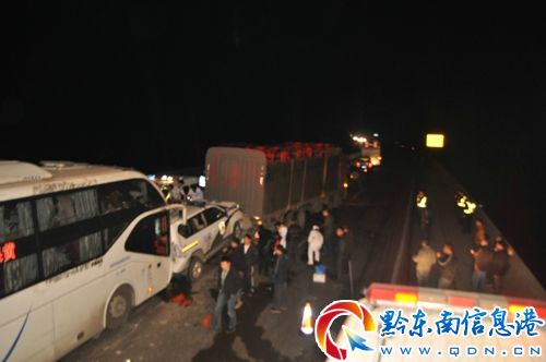 2013年1月27日19時21分,三穗縣消防大隊接到報警稱:滬昆高速上行線(湖南往貴陽方向)1602+200M處多車發生追尾事故,有人員被困,請求救援。三穗大隊接到報警后,迅速出動10名官兵分別乘坐1臺搶險救援車和1臺指揮車趕往事故現場。