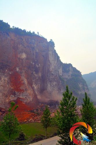 記者趕到現場時,坍塌面還有小規模巖體坍塌,它們掉落發出的響聲像打雷,而“雷”響之后,下方就會有大量的塵土像煙霧般升騰起來。而在坍塌面右側,尚有一塊較大危巖依附在巖壁的主體上,搖搖欲墜。凱里有關部門預測,該危巖約10萬方。