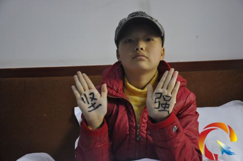 11月19日上午,記者來到凱里清平南路一家旅店采訪一位前來看病的白血病患者楊釗玉,期間,15歲的楊釗玉伸出那打滿針孔的雙手,亮出了寫在掌心的“堅強”二字,她說:“我要讓我哥知道,我能挺住”。