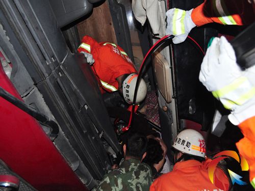 于是指揮員命令,戰斗小組利用液壓剪切鉗和液壓頂桿擴充救援空間,讓救援官兵有操作空間。首先利用液壓剪切鉗剪斷駕駛室操作臺,然后利用液壓頂桿頂住座椅和操作臺,使被困人員有活動空間,隨后指揮員發現被困人員可以從現有空間中救援出來,于是命令戰斗員扶住被困人員的大臂一點一點的挪出事故車輛,至此,成功將被困人員救出。