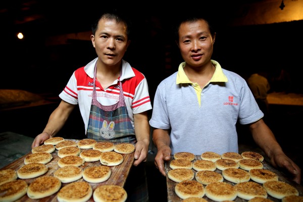 9月3日,在榕江縣寨蒿鎮的月餅制作坊里,幾位師傅正在用傳統的模子制作月餅。(王炳真李長華攝)