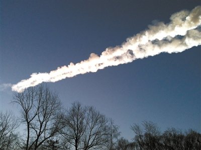 15日,俄羅斯車里雅賓斯克地區,隕石在天空中劃出一道長長的“尾巴”