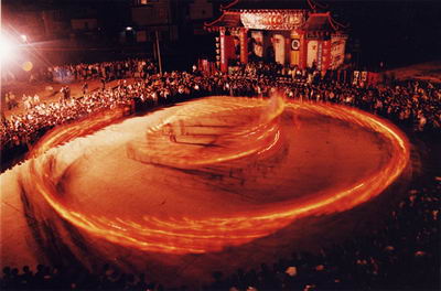 在石城,你可以看到春節(jié)期間鬧元宵的重頭戲——“迎燈”,是婺源民間流行最廣的一種傳統(tǒng)藝術.婺源方言中,“燈”與“丁”同音,迎燈有祝愿人丁興旺和慶賀吉祥之意。龍燈一般用竹骨彩紙扎成龍頭龍尾,龍身由各節(jié)花燈組成,內點蠟燭,每節(jié)板上兩盞花燈,長達2米,由一人手持。一條龍燈由上百節(jié)板燈連接組成。舞燈時,前宜制作精巧的“子母燈”引路,后有“龍尾鼓樂”伴奏,有“巨龍漫游”、“龍頭鉆陣”、“繩蟒脫殼”、“穿花打旋”和“飛龍?zhí)S”等動作陣勢。如幾條龍相聚時,其盤旋翻騰、圓直曲伸,配以大小爆竹,鑼鼓嗩吶,大有呼風喚雨翻江倒海之威勢。雖然傳統(tǒng)的習俗是元宵前后“迎燈”,但隨著外出打工的人數(shù)增多,年輕人過了正月初五,初六后就要外出了。因此,婺源的傳統(tǒng)民俗也與時俱進,時間提早了。有的村莊初五就開始迎燈,客人們將有機會大飽眼福。