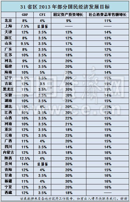 中國經濟網北京2月20日訊 全國31省區政府工作報告相繼出爐,中國經濟網記者整合了31個省份2013年的部分國民經濟發展目標,其中24個省區將今年GDP增長目標定在10%及以上,20個省區將固定資產投資增長目標設定在20%及以上,物價漲幅基本控制在5%、4%、3.5%三檔。在31省區的“經濟軍令狀”中,貴州在地區生產總值、固定資產投資上和消費品零售額上都將目標設定在最高位。如此大的發展步調,更加需要警惕GDP目標過高及投資沖動,在“量”的累積上“質”的積攢也同樣重要。