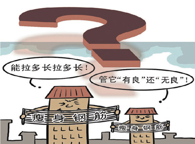 “一噸鋼筋本來只能做一層樓的柱子,拉長后,甚至可以做一層半的。”中國新興建設開發總公司總工程師汪道金說,“瘦身鋼筋”的伸張力被破壞,即鋼筋變“脆”了,會嚴重影響建筑的抗震性。房屋受到地震等巨大外力作用時,伸張力好的鋼筋會隨建筑的變形而被拉長,從而減緩其倒塌過程,延長人的逃生時間,而被過度冷拉變“脆”的鋼筋則會突然斷裂,使房屋迅速倒塌。