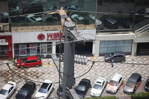 “都沒看到他是咋爬上去的,直到消防車開過來才發(fā)現(xiàn)高壓電線桿頂上還坐了個人。”昨日,目擊者李先生說,上午10時許,男子全身僅穿著內(nèi)褲。