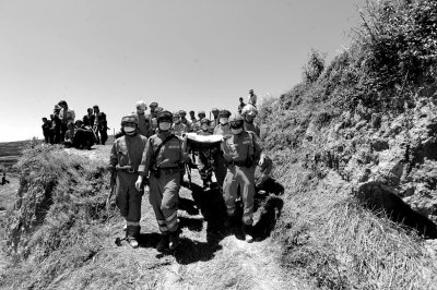 在村莊下方的一片地里,11具遺體擺成一列,他們身上遮著沾滿泥土的鋪蓋。很多人的手還保持著掙扎向上的情形。然而,50歲的車尕巧并不在其中,她是最后一名沒找到的失蹤者。在褚懷德指認可能是車尕巧的遇難之地,三只搜救犬在消防戰(zhàn)士的牽引下持續(xù)搜索。