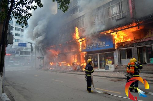 火災發生后,記者很快趕到了現場。著火點是臨街的7個門面,其中偏北部的5個門面火勢比較猛烈,大量煙霧不斷從門面中冒出,升向天空,著火大樓的上空濃煙滾滾。濃煙還有濃烈的味道,多位市民反映說,在幾百米開外的凱里大十字,都可以聞到。