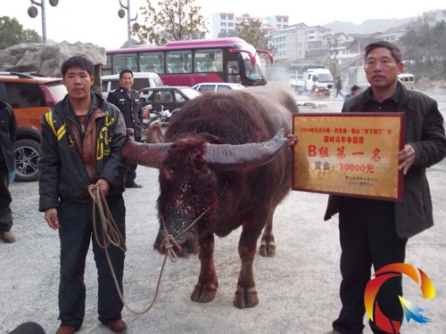在抽簽對陣中,麻江21號牛與雷山781號碰牛對斗打滿6分鐘雙雙進入下一輪,期間被打斷左角;而丹寨興仁5555號牛在與銅仁鴻發公司168號碰牛的打斗中敗北,榮獲第四名。在前三名循環賽第一架,麻江21號牛經不住銅仁鴻發公司168號碰牛的猛碰,在堅持約40秒后,落荒而逃。第二架,在銅仁鴻發公司168號碰牛和雷山781號碰牛兩頭碰牛之間展開角逐,而這一架只要堅持超過40秒,就變為冠亞軍爭奪。比賽開始,168號碰牛先進到場內,781號碰牛自場外進入,兩頭碰牛一相見,便箭一般沖向對方,只聽“嘣”的一聲,兩頭碰牛重重的碰在一起展開廝殺,引起場內數千名觀眾陣陣喝彩。打斗中,雖然781號碰牛在前面的比賽中雙角被打斷,卻依然越戰越勇,而168號碰牛則節節敗退,在堅持了9分25秒后敗北,獲得第二名,主場作戰的781號碰牛獲得第一名。(張希才 文 壽 攝影報道)