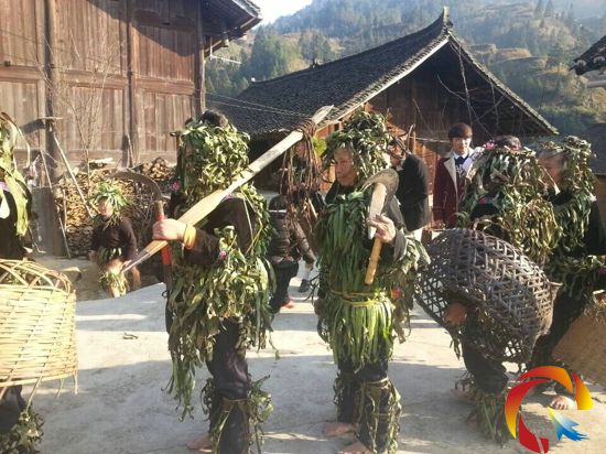 據介紹,苗年節期間,當地的苗族婦女不著民族盛裝,而是到野外找來芭蕉葉裁成衣服穿在身上。她們跳蘆笙時,農具就是她們的舞蹈道具。一般情況下,她們肩要扛挑系草繩的長扁擔,手拿割草用的大鐮刀或捕魚的魚罩。讓人吃驚的是,此間,毛坪村的溫度極低,溫度僅5度左右,但這些苗族婦女卻光著腳板跳蘆笙。