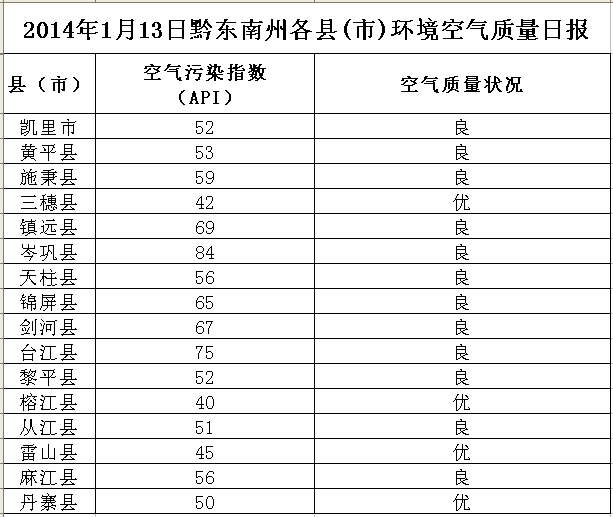 2014年1月13日黔東南州各縣(市)環境空氣質量日報
