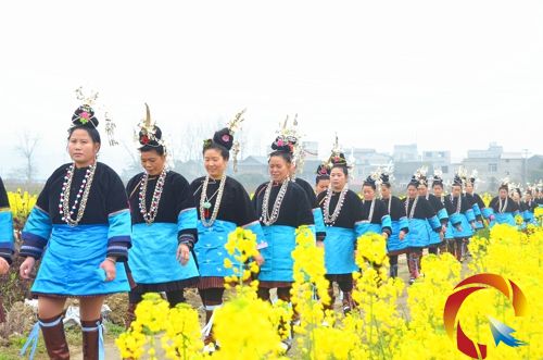 薩瑪節(jié)當(dāng)天,身著節(jié)日盛裝的侗族婦女走過一片油菜田