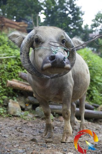 本網訊 榕江縣古州鎮高文村九里五組賈勝平家有一頭兩角向下彎曲的水牛,長相頗為怪異。