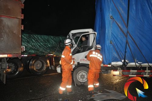本網訊 5月9日5時許,在滬昆高速臺江至凱里路段,兩輛卡車由于前方堵車,后車車速過快發生追尾事故,造成1名駕駛員被困。臺江消防接警后,立即出動官兵趕赴現場救援。