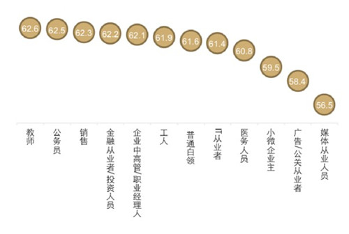 報(bào)告還顯示,工作越穩(wěn)定,睡眠質(zhì)量越好。其中,教師以62.6分位列各職業(yè)睡眠指數(shù)得分第一名,公務(wù)員則以62.5分緊跟其后。睡眠指數(shù)得分最低的則是小微企業(yè)主、廣告/公關(guān)從業(yè)者和媒體人,得分均在及格線以下,其中媒體從業(yè)人員以56.5分列十二類職業(yè)的末尾。