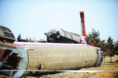脫線列車發(fā)生側(cè)翻的車廂(4月13日攝)。新華社發(fā)