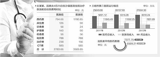 2013年,三明22家公立醫院人均住院費用4692.32元,較改革前2011年的5020.99元下降328.67元,下降6.55%。