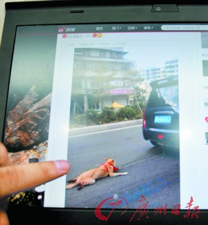“惡性虐狗”等字眼在汕頭網絡圈傳播。記者也在自己的朋友圈和微博看到了圖片,圖片的拍攝角度幾乎是一致的,應該是在同一路段拍攝的4張照片——照片上,一輛懸掛粵D汕頭車牌的輕型面包在馬路上,車尾系著一根繩子,而繩子的另外一頭則套在了一只小狗的脖子上。