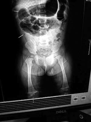 北京晨報記者了解到,目前體內的12根鋼針多分布在孩子的臀部,一根在腹部,其余3根在胸腔附近,其中一根很接近心臟(如圖)。“因為孩子太小,醫(yī)生們害怕取針的時候對她造成傷害,在胸腔附近的3針可能會威脅她的生命”。