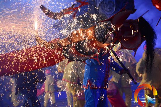 當晚,隨著鑼鼓聲的響起,兩條巨龍在表演場上“騰飛”起來,人們用花筒往龍頭、龍身、龍尾噴射,頓時巨龍火光四射,把整條長龍舞得活靈活現(xiàn),巨龍時而上下飛舞,時而左右翻騰,時而猛龍出海,時而騰云駕霧,整個場面十分壯觀;瞬間,表演現(xiàn)場很快擠滿了圍觀群眾,歡呼聲、鑼鼓聲、鞭炮聲融匯成一片。