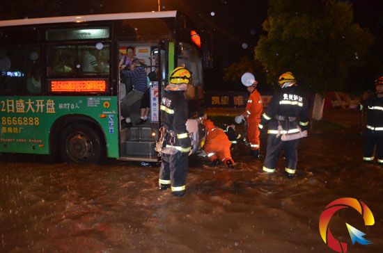 本網(wǎng)訊 5月26日21時59分,位于凱里市迎賓大道大修廠路段,因暴雨突襲,導致路面低洼處形成大量積水,一輛公交車被困路上,并有多名乘客滯留在車上。凱里市消防大隊特勤中隊接警后迅速出動3輛消防車22名消防官兵趕赴現(xiàn)場。