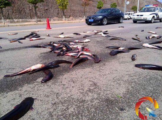 運(yùn)魚(yú)車(chē)泄漏 上千條魚(yú)橫躺大街(組圖)
