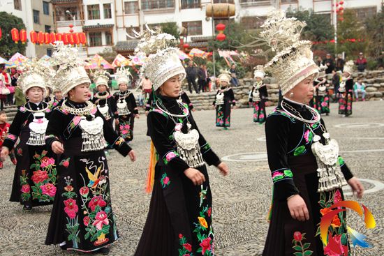 3月1日雷山方祥的蘆笙代表隊到縣城載歌載舞歡送新年,圖為方祥的精美服飾