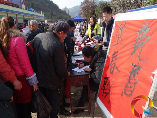 本網訊 麻江縣組織社會各界書法愛好者書寫春聯2萬余幅,利用送“科技、文化、衛生、法律、廉潔”五下鄉活動免費向群眾發放,受到百姓的歡迎。圖為2015年1月20日麻江縣向各族群眾發放春聯。(李興義 攝影報道)