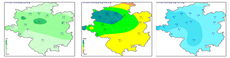 氣溫:1月中旬我州各地平均氣溫5.7~9.4℃ (圖1左),與歷年同期相比偏高1.6~3.5℃(圖1中);旬極端最低氣溫-0.1~4.5℃(圖1右),出現在14~15日。13~15日地勢較高地區日最低氣溫接近0℃,出現霜凍。
