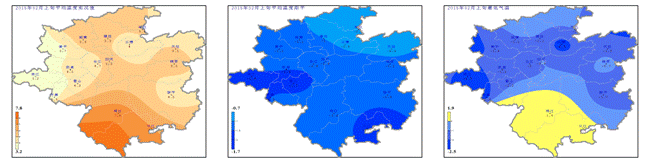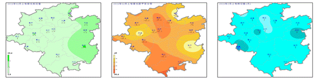氣溫:2月上旬我州各地平均氣溫5.4~7.8℃ (圖1左),與歷年同期相比偏低0.7~1.7℃(圖1中);旬極端最低氣溫榕江、從江分別為1.9℃、0.6℃,其余大部地區為-2.5~-0.7℃(圖1右),出現在6日。