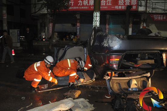 4時33分,消防官兵到達事故現場后,發現一輛小轎車“四輪朝天”翻在公路邊上,現場到處散落著車輛零部件,周圍聚集了圍觀群眾,車內有3人被困,不時發出陣陣呻吟聲。根據現場情況,消防官兵一邊安撫被困人員,一邊利用救援工具把轎車車門破拆打開,先將后排座兩名被困人員救出。隨后,消防官兵對駕駛室位置進行擴張,很快便將駕駛員救出,并將傷員送上救護車送往醫院救治。