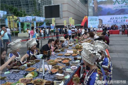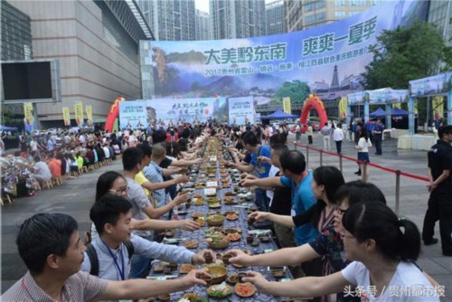在中午開席的長桌宴上,重慶市民一邊品嘗黔東南本土酸湯魚、鼓藏肉、臘肉、酸筍子等美食,一邊欣賞了民俗歌舞表演,特別是獨具黔東南苗族特色的高山流水敬酒禮儀吸引市民爭相體驗,引爆全場。
