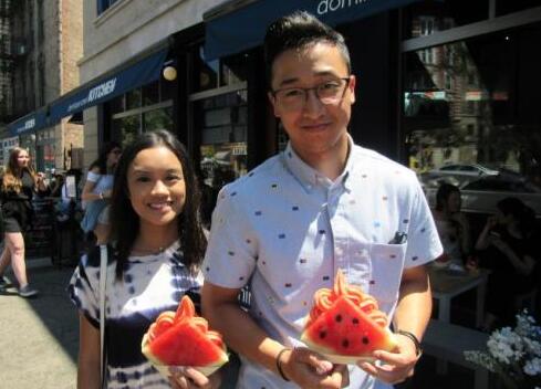 西瓜冰淇淋原本在東京販賣,因為太過熱門,又紅回來了紐約,從上周六(7月1日)開賣,4日為最后一天販賣。美國獨立日中午12時開店前,門外排了長長的隊伍,聚集滿滿的嘗鮮人潮,隊伍中更不乏華人面孔。還有人甚至穿著西瓜裝、提著西瓜包來買西瓜冰淇淋,形成獨立日的另一風景。