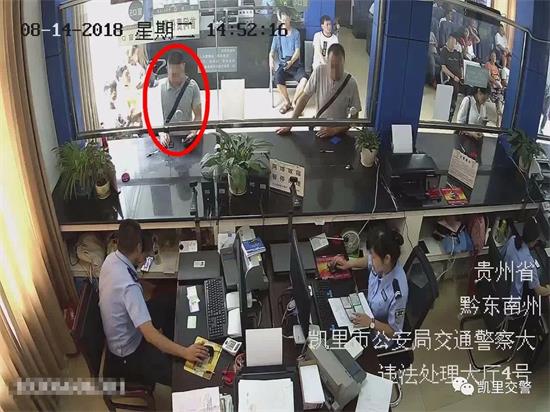 凱里市公安局交警大隊民警 張成林:“辦事駕駛員取號過后,直接到5號窗口來處理,我們的民警在跟他刷身份證的時候,發現網上彈出是在逃人員,隨后就通知了我,我過來進行核查后,確實是在網上在逃的,我就打電話給領導匯報,讓領導派人過來;在此期間,我們的民警一直在跟駕駛員解釋,拖延時間,把他穩住,怕他發現后逃跑;然后我們案件中隊的幾個民警趕到后就把他給控制了。”