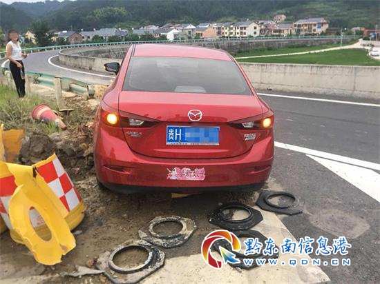 當日下午19時,黔東南州公安局交警支隊高速五大隊接到報警后,趕到事故現場,發現是一輛紅色馬自達牌轎車迎頭撞上高速公路互通匝道中間隔離護欄發生單方道路交通事故,造成車輛前端嚴重受損,防撞桶被撞壞,護欄嚴重變形,灑滿一地碎片,現場一片狼藉。
