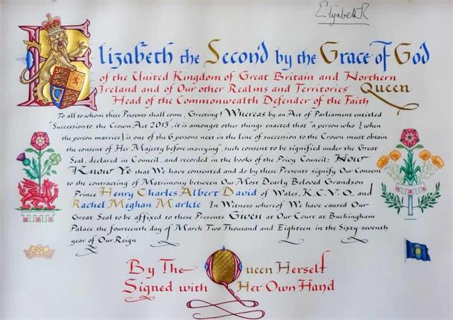 哈里王子與美國(guó)女演員梅根·馬克爾大婚準(zhǔn)備的精致許可文件。